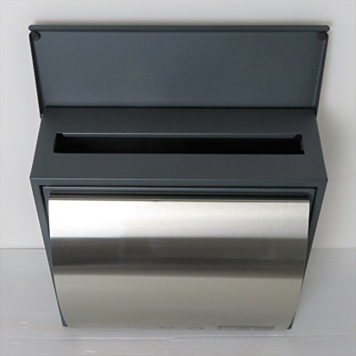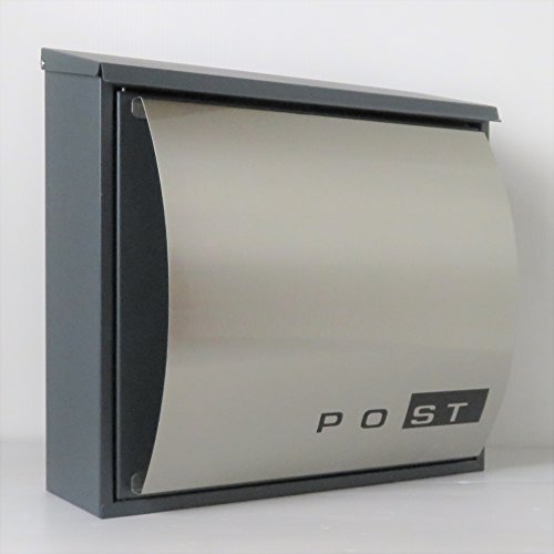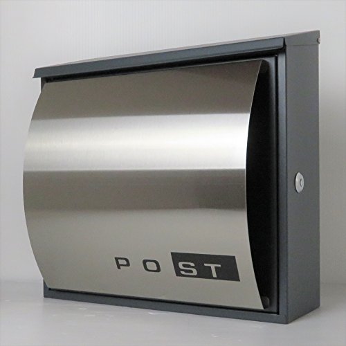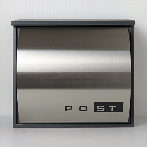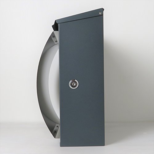 お洒落なモダンデザイン郵便ポスト:お蔭様で年間販売1万個を達成♪ 【サイズ】(最大部)巾350x高さ330x奥行170mm 【投函口】約300x30mm 【付属品】高級キーホルダー1個、カギ2本、アンカープラグ4本、ネジ4本、ゴム栓4個 【重量】1セット約3kg 【素材】めっき鋼板・ステンレス 【仕上げ】(本体)グレー 灰色;(フロントパネル)シルバーステンレス色 【仕様】壁付けまたはスタンド、A4サイズ(本体内部幅340×奥行100×高さ300mm)、上入れ前出し 横開き 新聞ホルダー付き(350mm×60mm×260mm) 【特徴】 カギ付きカギなしでもご使用可能♪ 洗練デザイン★錆びにくい加工♪ シンプル・取り付け簡単♪マグネット式・使い勝手抜群♪ 大きいサイズ★厚い通販カタログ数冊も入る大容量♪ 【製造メーカー情報】:本場ヨーロッパモダンデザイン郵便ポスト専門製造工場。 【ご注意】鍵が共通しないので、紛失しないでください♪ 従来品との違い: 1.手垢などの汚れを掃除しやすいため、ポストの表と裏隅々までは塗装仕上♪ 2.マグネット式、カギを使わなくてもご使用可能♪