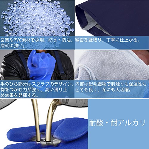 - 良質なPVC素材を採用、防水・防油・耐酸・耐アルカリ、磨耗に強い。内部は起毛織物で肌触りも保温性もとても良く、冬にも大活躍。注意:高濃度酸(高濃度硫酸、高濃度硝酸など)、高濃度アルカリの環境で使用しないでください。