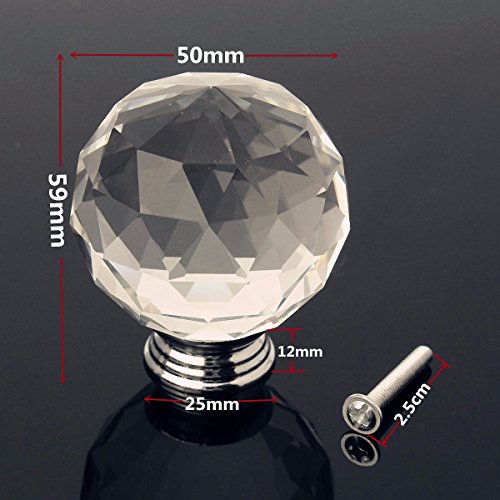 Specifications:Quantity2 piecesScrew length2.5 cmKnob height59 mmTop base diameter50 mmBottom base diameter25 mmMaterialCrystal Glass + Zinc AlloyColorTransparent handle knock+Silver base