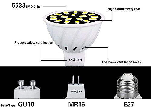 - Color Warm White Base GU10 - Color Pure white Base GU10 - Color Warm White Base E27 - Color Pure white Base E27 - Color Warm White Base MR16 - Color Pure white Base MR16 -