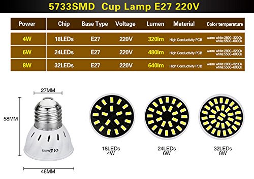 Specifications :E27 GU10 MR16 8W 32 SMD 5733 Pure White Warm White LED Spot Lighting Lamp Bulb 220V Voltage : AC220VBase Type : MR16 / GU10 / E27Wattage : 8WLumen : 640LMLED quantity :32ledsLED type : SMD5730Beam angle : 60 ° (Gold angle)Housing Material : PlasticColor & temperature : Warm White (2800-3200K) White (5500-6000k) Features :Low consumption, high brightness.Energy-saving and environmentally friendly, is conducive to recycling.Low heat generating, no UV or IR light radiation.Seismic, impact resistance, non-thermal radiation, safe and stable, reliableSuitable for home, office and exhibition lighting Very low heat generating, besides saving light powerIt has a long lifespan, no hazardous materials.Instant start, no flashing. Solid state, shockproof.Save power more than ordinary bulbs.Made of high quality materials. Package Contact : 1 x led spotlight