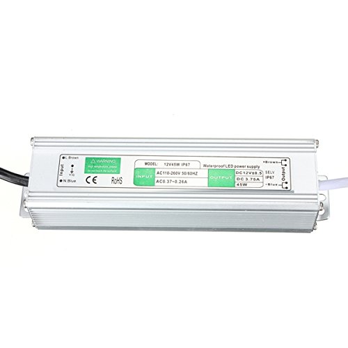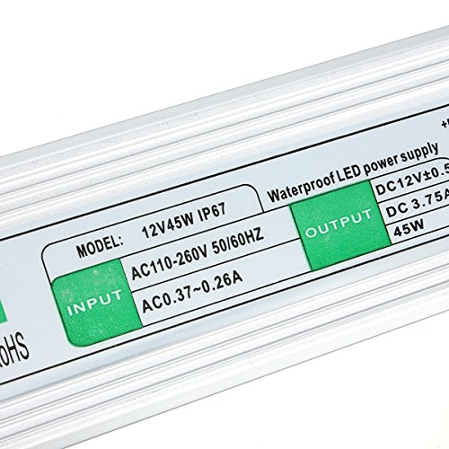 Specification:Item Type: LED DriverWattage: 45WInput Voltage: AC110-260V 50-60HZOutput Voltage: DC 12V 3.75AShell Material: Aluminum AlloysWaterproof Level: IP67Size (L x W x H): 157mmx44mmx33mm Feature:Waterproof level is IP67,can be used in shallow water, for outdoor useWith the functions of overvoltage protection, short circuit protection and overload protectionSuitable for all LED light which need DC12V power supplyIt is easy connection and simplicity to use Package Included:1 x Power Supply Driver