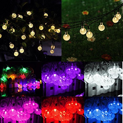 Specification:Material: PlasticSwitch: 2(Power ON/OFF MODE)Flash Mode: Long bright +single flashNumber Of Bulbs: 30 LEDsDiameter Of Bulbs: 2.5cmSolar panel: 2vRechargeable Ni-MH battery: 600mAhLight Distance: 15cmLead: 20cmCharging time: 6 hoursWorking time: 8 hoursTotal length: 6.35mLength from solar panel to first light: 15cmFeatures:-Waterproof, suitable for indoor and outdoor.-Powered by sunshine with efficient solar panel kit, energy-saving and eco-friendly .-Rechargeable battery, pre-installed behind the solar panel.-On/Off Switch for optional manual operation beside the bulb.-Come with ground spikes/stakes for easy fixation.-Usage Tips: At the first time of usage, please turn the switch ON and let the lights get fully charge over 8 hours for normal usage .Package includes:1x Solar String Lights