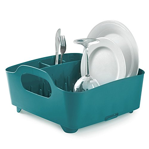 Color:Teal The Tub dish drying rack by Umbra features a convenient all-in-one design for today's streamlined kitchen. Available in a variety of fashion colors such as this vibrant teal, Tub is constructed of durable, easy-to-clean, BPA-free molded material. Tub's self-draining design works both in the sink and on the counter. For counter-top use, the angled base collects and diverts water run-off back into the sink, eliminating the need for a bulky, unsightly drip-tray. Interior pegs allow dishes to be stacked in any direction and accommodate glassware as easily as plates and pots. The built-in utensil caddy is generously-sized for holding cooking tools and flatware. Designed with sturdy, generous handles for maximum portability, Tub is easily transferred fully-loaded from sink to counter and back again, and can also double as a roomy dish-and-utensil caddy for parties and outdoor entertaining. Measures 15-inch by 14-inch by 7-1/2-inch. Designed by Rafael G. Urdaneta for Umbra - original, modern, casual, functional and affordable design for the home.