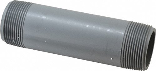 This Spears schedule 80 CPVC nipple fitting has male NPT threads on both ends and is suitable for connecting pipes with the same diameter. The National Pipe Taper (NPT) threads create a tighter seal than straight threads. The fitting is made of medium gray CPVC (chlorinated polyvinyl chloride) for chemical and corrosion resistance, high strength, and better resistance to high temperatures and pressures than PVC (polyvinyl chloride), making it suitable for both hot and cold water pressure distribution systems in residential and commercial applications. CPVC can be connected to other materials, such as steel or copper, using transition fittings. The fitting has a maximum operating temperature of 200 degrees F, meets ASTM International D1784 and F439 standards for quality assurance, is certified by National Sanitation Foundation International (NSF) for potable water service, and is American Bureau of Shipping (ABS) Type Approved for marine and offshore applications. This schedule 80 CPVC nipple fitting is suitable for connecting pipes for conveying drinking water, waste water, chemicals, and other liquids in a range of industries.Pipe fittings are components used for connecting, terminating, controlling flow, and changing the direction of piping in many different industries. When purchasing pipe fittings, consider the application, as this will affect material type, shape, size and required durability. Fittings are available threaded or unthreaded, in many shapes, styles, sizes, and schedules (pipe wall thickness).Spears Manufacturing produces thermoplastic fittings and valves for fluid, drain, waste, and vent systems. The company, founded in 1969 and headquartered in Sylmar, CA, meets International Organization for Standardization (ISO) standard 9001.