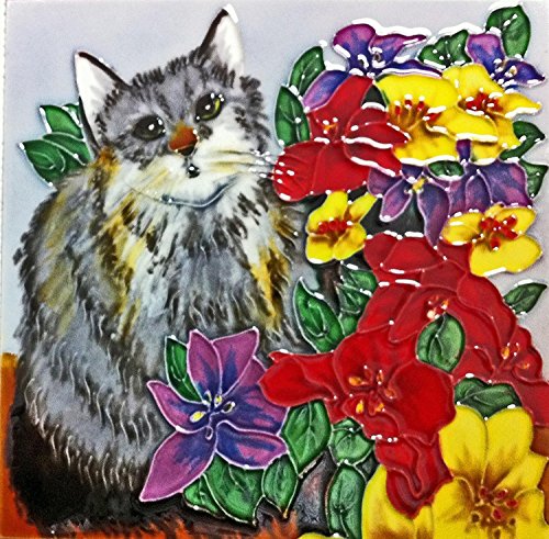 High Quality BD-2016 8 by 8-Inch Grey Cat with Flowers Ceramic Art Tile