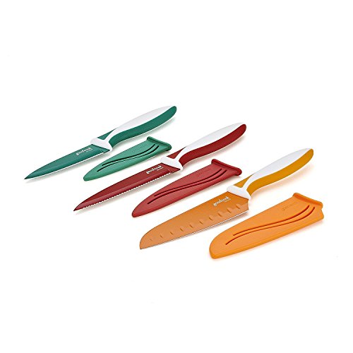 - Includes a 5 inch Santoku Knife, 5 inch Serrated Utility Knife, and 4 inch Paring Knife