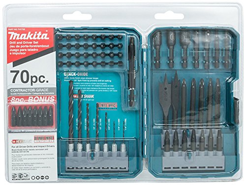 Style:70-piece From the Manufacturer The Makita T-01725 70-piece drill and driver set is a great value -- more accessories, more savings. Every tool is black-oxide coated to resist corrosion, and given a proprietary heat treatment for sharper, longer lasting life. Manufactured with Ultra-Lok 1/4-inch hex shanks, the tools are compatible with all quick-change connector systems, electric or battery-powered drill/drivers, and impact drivers. The drill bits are manufactured using high-speed steel with precision 135-degree split-point tips to prevent drill bit walking. The pro-grade, maximum magnetic 3-inch bit holder and nut drivers provide extra-strong fastener retention.