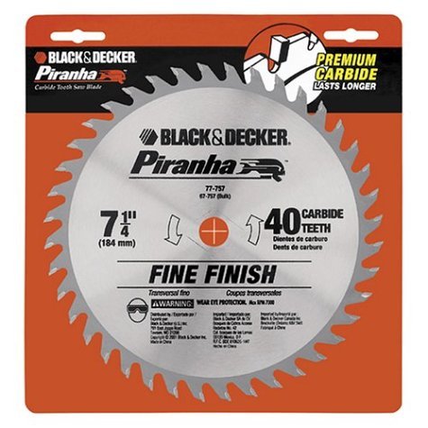 Product Description Black & Decker Circular Saw Blades 7-1/4'' diameter 40 Teeth Ripping / Crosscutting - Carbide Consumer Grade Circular saw blade Alternative tooth bevel, .071 plate, +15 degree hook angle Industrial carbide provides longer life Patented curved teeth cut faster Fully sandblasted plate reduces friction Fish hook gullet design removes chips more effectively Thin kerf, .045, circular saw blades for table saws Cuts all types of wood, plywood, particleboard, chipboard, Masonite, wallboard and plastics Reinforced shoulder for greater durability; expansion slots for improved accuracy Expansion slots prevent warping 5/8'' round/diamond arbor Coated to resist residue Carded From the Manufacturer Piranha circular saw blades are offered in sizes from 5-1/2 to 10 inches in diameter for the most common applications. They are offered with a variety of tooth counts to do everything from fast cut ripping to general purpose cutting to fine finishing. An aggressive tooth geometry and ultra thin kerfs allow the blade to cut through a variety of materials faster while the heat treatment gives the blade longer life than traditional carbide blades.