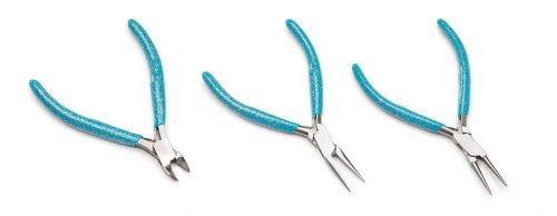 Professional quality jewelry pliers set includes chain nose, round nose and side cutter pliers. Decorative glittery handles make pliers easy to find while working on complex and potentially cluttered projects. Set of 3 jewelry-making pliers simplifies detailed or meticulous tasks. Side-cutter pliers snip easily through findings, pins, and wire up to 1-3/5 millimeters. Chain-nose pliers shape, twist, and squeeze, while round-nose pliers create loops and coils. Smooth jaws protect against scratching.