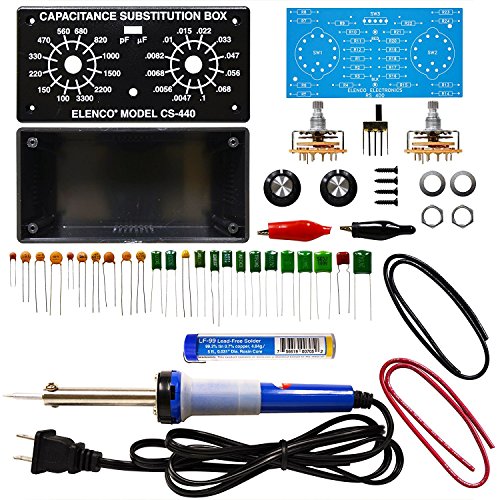 Are you a Do-It-Yourselfer? Hone your soldering techniques on Elenco's Capacitor Substitution Box Soldering Kit. The Capacitance Substitution Box is a convenient instrument in determining the desired capacitance values in circuits under design or test. The values selected for your capacitance substitution box were determined to be the most commonly used in modern solid-state circuits. The values are from 100pF to .1μF in 24 steps. Printed Circuit Board (PCB) and components including 24 capacitors, switch, knobs, alligator wires, jumper wires and more all included along with manual and instructions. Plus 25 watt soldering iron, stand and lead free, rose core solder. From the company that brings you Snap Circuits - 9 volt battery not included. - MADE IN THE USA - Elenco was founded more than 30 years ago by 2 engineers. The core of Elenco is still strong engineering and design skills. Elenco test equipment has proven to be reliable as well as affordable. Elenco supplies Universities and High Schools with quality educational kits and materials.