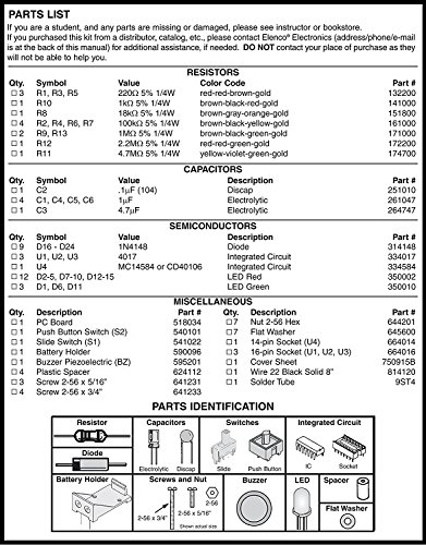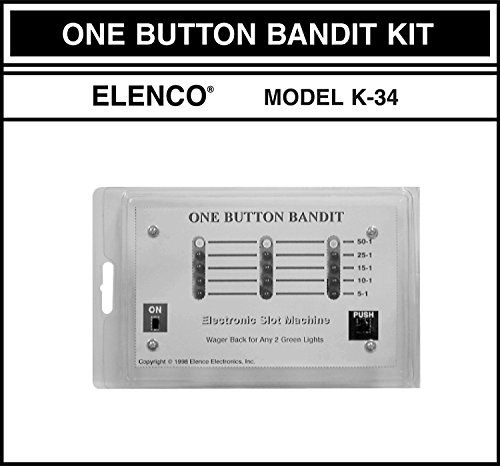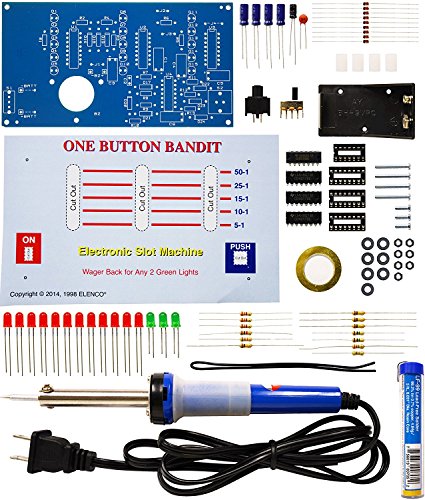 Are you a Do-It-Yourselfer? Hone your soldering techniques on your new One Button Bandit Soldering Kit. The Elenco K-34 One Button Bandit Kit simulates an electronic slot machine. Press the button and watch the LEDs simulate a Vegas style slot machine. Complete with all components and printed circuit board. Easy-to-follow assembly; trouble shooting; self test. Printed Circuit Board (PCB) and components including resistors, capacitors, switches, IC and diode semiconductors, IC sockets, jumper wires and LEDs all included along with manual and instructions. Plus 25 watt soldering iron, stand and lead free, rose core solder. From the company that brings you Snap Circuits - 9 volt battery not included. - MADE IN THE USA - Elenco was founded more than 30 years ago by 2 engineers. The core of Elenco is still strong engineering and design skills. Elenco test equipment has proven to be reliable as well as affordable. Elenco supplies Universities and High Schools with quality educational kits and materials.