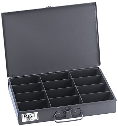 Size:12-Compartment The Klein 54437 12-Compartment Mid-Size Parts-Storage Box features a heavy, metallic-gray baked-enamel finish, and strong, rigid, heavy-duty welded construction. Full-length piano hinged covers are designed to stay open for ease of access. This box has a carrying handle and a positive pull-down locking catch. The 13-5/6-Inch wide, 9-3/4-Inch long (front to back), by 2-Inch high storage box features twelve (12) 4-5/16-Inch by 2-5/16-Inch compartments. The 54437 box compartments feature high-impact styrene construction. A scoop-bottom design allows for easy parts removal and cleaning. The 54437 fits either four-drawer slide rack catalog number 54474 or six-drawer slide rack catalog number 54476. Since 1857, Klein Tools has manufactured the world's finest hand tools.  Today, Klein Tools is the No.1 choice among professional tradesmen.  We manufacture more than 3,000 tools and accessories, including pliers, cable and bolt cutters, wire strippers, voice-data-video tools and testers, fish tapes, conduit benders, drill bits, insulated tools, gloves and many other high-quality products. Klein Tools' dedication to quality and innovation continues with products available for professional tradesmen worldwide.