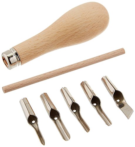 This cutting tool set is designed for linoleum, hard and soft rubbers and vinyls, and soft woods like balsa and bass wood. Set includes a beechwood handle with unique blade remover and five specially selected 0.6mm cutting blades: #1 V-shape, #2 small U, #3 (3mm) U, #4 U (4.5mm) gouges, and blade knife cutters. Cutter blades are made of hardened carbon steel and can be resharpened. Comes attractively packaged in a plastic box with separate nib compartment.