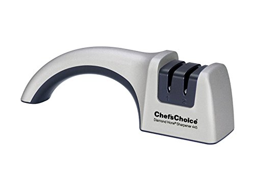 Introducing the manual sharpener that really works at a price that can't be beat! The new Chef's Choice Model 445 professional knife sharpener is ideal for kitchen, hunting, fillet and pocket knives This 2-Stage sharpener features separate sharpening and honing stages for incredibly sharp, longer lasting edges. Using 100% diamond abrasives, it sharpens the full blade length-from tip to handle. Designed for both right or left handed users, it's fast and easy to apply a superbly sharp knife edge. The knife guides ensure a uniform edge with no guesswork. Safe for quality knives. The Model 445's ergonomic handle is comfortable to hold and fits all hands. Slip resistant rubber feet securely grip work surfaces. Designed, engineered and assembled in the U.S.A.