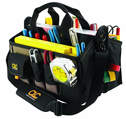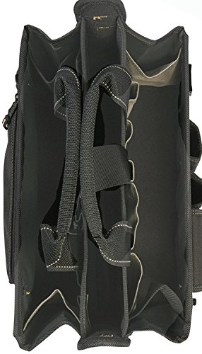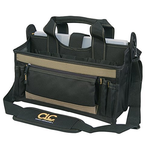 About Custom Leathercraft This unique company really doesn't like to show off ・Eヲ they just like to get the job done. Starting with leather and later expanding into expertise with modern materials, this manufacturer makes high-quality, no-fuss accessories for your working life. 16-inch center tray tool bag. Polyester with padded handle and shoulder strap. Multi-compartment plastic tray. 8 exterior pockets and 7 interior pockets. Metal tool snap and electrical tape holder. Dimensions: 16L x 9W x 9H inches.