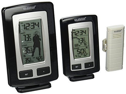 Two displays featuring wireless weather technology offers double convenience. Fast, accurate 915MHz signals send outdoor information from included weather resistant sensor up to 200 ft. unobstructed to two indoor base units. Both units display current indoor & outdoor temps, digital time and MIN/MAX records and easy 1 button reset. Batteries not included.