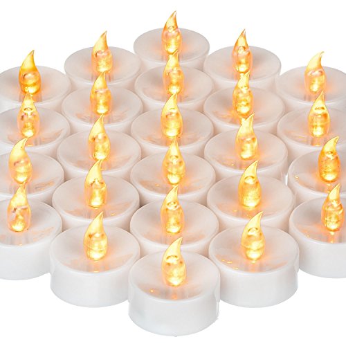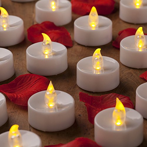 Let our flameless tea lights inspire you we've got the absolute best make and model of these battery-operated, flameless tea light LED candles, which are available now in packages of 24-batteries included. Mars LED tea lights information: Color: Yellow flickering light contains 24 tea lights and batteries 100 faux rose petals there will never be any danger of the candle starting a fire or burning someone if it happens to tip over you've got holiday decorations, stocking stuffers that fit any holiday, occasion, valentines day, space, and standard-sized votive candle holder the yellow light flickers like magic and looks so realistic that people will think they're seeing real LED sparks fly you don't have to worry about running out of matches because all you need to do is turn these electric candles, sit back, and enjoy the sparkle-no worries you can turn them on and off easily (the switch is located on the bottom) and place them anywhere you'd like without setting off a smoke detector.