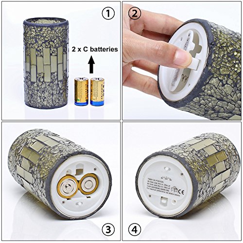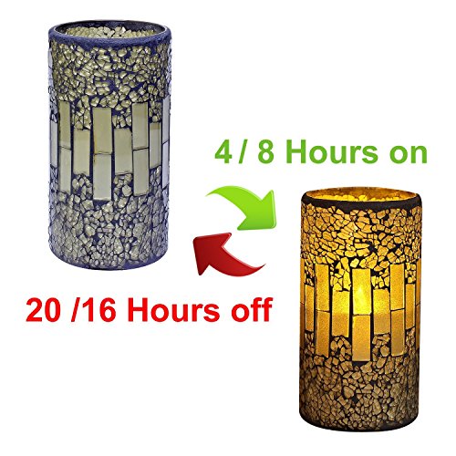 Package: Package of 1* Mosaic LED lightBattery powered: 2*C, not included. Dimension: 6 inches tall by 3 inches diameter , Main material: premium Wax & glass &cement. Excellent Proudct to decorate table centerpieces and they are simple and elegant with any of your holders. Best product for wedding receptions, prayer, dinner parties, holiday gatherings and other events. look beautiful and realistic. Time Function: Automatic timer function, Set for 4 or 8 Hours, Activates for same time every day when set : 4H : 4 hours lights up, 20 hours off, automatically turn on at the same time on the next day. 8H : 8 hours lights up, 16 hours off, automatically turn on at the same time on the next day. OFF : OFF Quality guarantee: Full of Products Pass the CE verification. Products in full compliance with the ROHS and CE standard. Customer Service If there is Any question. Any Special requirement, Please contact us first. We always be here for you! Create Your New Environment Now! ・EEE「 SAFE!!! Our candles are smoke-free, flame-free, and heat-free. Providing peace of mind and safety without the associated risks of traditional candles. Flameless Candle doesn't have an open flame and it doesn't heat up during usage. ・EEE「 Applicable Users: Anybody. Our candles provide perfect results for those suffering from COPD, smoke allergies or hypersensitive asthma. Very easy to use, these candles can be turned on and off by the flick of a switch. ・EEE「 Use For Occasions: Ambience, Holidays, Romance, Celebrations, Events