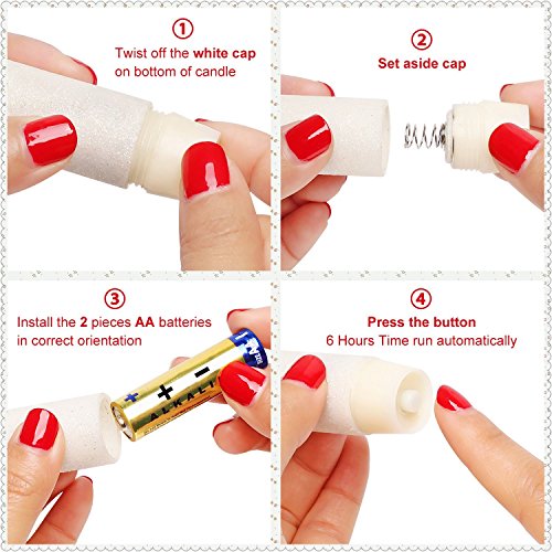 - 6-Hour Timer Feature・E・EInside the candle there are a 6-hour TIMER, ON/OFF switch for easy & convenient operation. The lights will be lit for 6 hours and then they will AUTOMATICALLY turn off for 18 hours and keep repeating this process, no waste of battery at all. Good choice for making surprise.