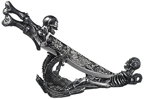 - Ghoulish decorative dagger is destined to delight any fan of the dark side! A chilling demonic dragon design is featured along the wickedly curved blade, as well as the skeletal handle and frighteningly lifelike faux pewter stand.