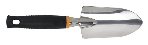 Product Description This Softouch Trowel is the perfect tool to reduce hand fatigue while digging in the garden. A contoured, Softouch handle provides excellent comfort and control, and the rust-resistant, extra-large aluminum head features a sharpened blade edge to cut into the ground with ease. The rust-resistant, one-piece aluminum head will not bend or break, and a handle hole provides convenient hanging storage. Lifetime warranty. Amazon.com The Fiskars softouch polished aluminum trowel features a comfortable and sturdy grip molded over a rust-free polished aluminum shaft. The oversized cushion grip is easy to hold, even during extended use, and the one-piece high strength cast aluminum alloy resists bending. The unit's patented grip features a 'flat end' that allows the user to push the tool into a variety of different soils easier. The shape also helps maintain a neutral wrist position to reduce fatigue. The tool comes with a hang hole for convenient storage, and a limited lifetime warranty.