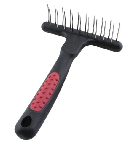The Paw Brothers Double Rake features long curved pins that reach deep into the undercoat to gently remove tangles and dead hair.