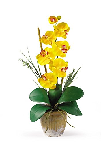 Color:Yellow Bursting with color and personality the Phalaenopsis is perhaps the most popular variety of all the orchids. Six lively blooms and two buds are complimented by genuine bamboo, which enhances the silk plant's authenticity. Featuring nearly natural leaves, moss and roots, this familiar favorite is sure to charm the masses.
