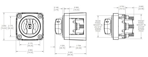 6005m-Series (Mini) Battery SwitchSingle Circuit ON/OFFSwitches a single battery to a single load groupMultiple switches can be used to manage several isolated circuits including cross connecting for emergency parallelingFeatures:Ignition protected - Safe for installation aboard gasoline powered boatsCase design allows surface, front panel, or rear panel mountingIsolating cover with snap-on sections protects rear contacts3/8-16 tin-plated copper studs for maximum conductivity and corrosion resistance, accepts 3/8 and M10 ring terminals7/8 (22.22mm) stud length to accept multiple cable terminalsIdeal for marine or RV applicationsAll non-corrosive marine grade metalsMolded in durable reinforced polycarbonateTactile textures indicate knob position by feel onlyLabel with international ON/OFF legendsRemovable key or knob remains positively retainedICON label set included for circuit identification