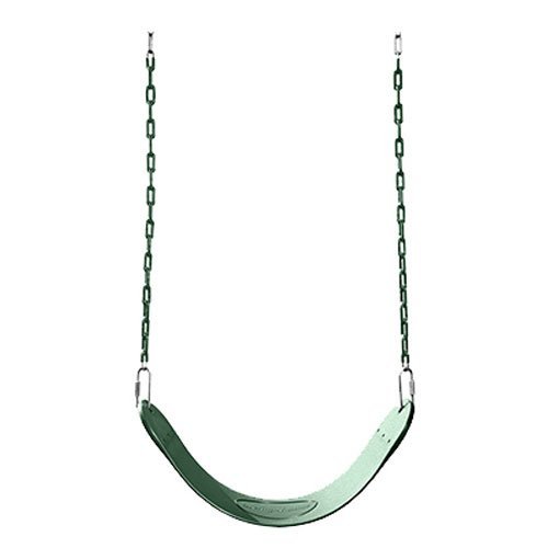 Color:Green This soft green plastic belted swing seat features zinc plated steel chain with vinyl coating for a comfortable grip and steel quick link connections for easy installation. The curved oval design of the flexible seat provides a comfortable ride.