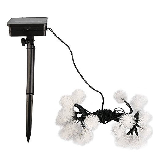 Color:White Features:1.This string light illuminates during night, performs a charming atmosphere to your gardens, patio, lawn, porch, gate, yard, etc.2.By converting solar energy into electricity, the solar panel charges the battery during the day and the built-in sensor turns on the light automatically at dusk. 3.Easy to install, make the parts together and then insert the stake to the ground to make it steady.4.Super long working time, it can continuously illuminate more than 8 hours at night if the panel absorbs enough sunshine during day. 5.The battery should be charged over 6 hours and exposed to direct sunshine, this will give you a better use experience.Specifications: 1. Color: White2. Balls quantity: 203. Length: 4.8M/15.4ft4. Solar panel type: 70x80mm Amorphous silicon 5. Battery: built-in 1.2V 240mAh NI-MH battery6. The distance from the first ball to the solar panel: 1.5m7. The distance between two lamp beads: 18cm10.Charging time: 6-8 hours11.Working time: 8-12 hours 12.Function mode: Steady-on and twinkling Noted: 1. Though it's waterproof, to maintain a long using life, please do not use it in the water.2. Make sure the solar panel is exposed to direct sunshine.3. Make sure the switch is turned to 'ON', if not, the battery will not be charged.Package Includes: 1 x 4.8M 20 Warm White LED Solar Decorative Chuzzle Ball Fairy Lights with solar panel unit