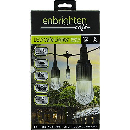 Color:Black ツ|ツ Style:12 ft.|6 LED Bulbs Perfect indoors and out, these string-style lights are great for your office or studio, deck and patio lighting, home accent lighting, and for adding style to and improving the atmosphere of an outdoor get-together. They feature lifetime LED bulbs that never need to be replaced, and are made from unbreakable acrylic that can withstand a ten-foot drop and are weatherproof, making them perfect for use year-round. Enbrighten LED Cafテゥ Lights by Jasco include six bulbs on a 12-foot string and are linkable up to 350 feet, so you will be sure to have as much light as needed to illuminate any space. This product is UL listed for permanent indoor/outdoor installation and is backed by a limited-lifetime LED warranty.