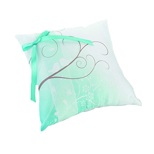 Lillian Rose 7' Love Birds Ring Pillow. This white satin ring pillow is silk-screened on the front with aqua-colored artwork that includes a pair of love birds on a tree branch. An aqua satin bow accents the top left of the pillow. Size: 7' x 7'.