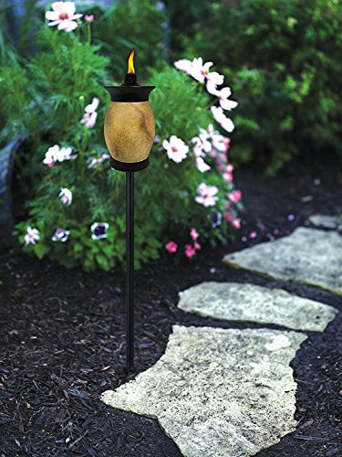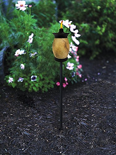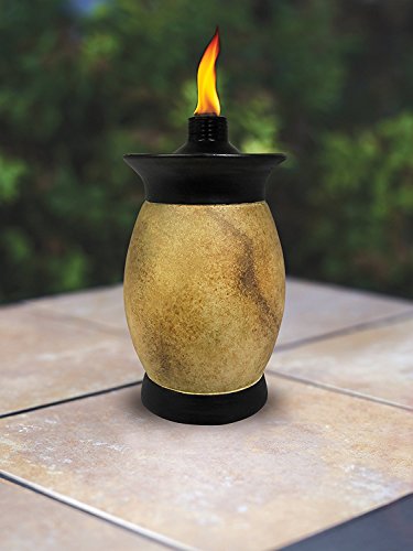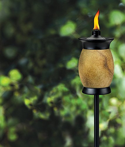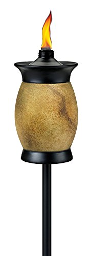 Color:Travertine Versatile 4-in-1 torches designed to resemble travertine stone finish. These durable resin and metal torches can easily be converted to: a full-sized torch, a mid-sized torch, a deck-mounted torch (deck clamps included), or an outdoor tabletop torch. Customize height of torches with included 4-piece pole. Each includes an easy-to-fill, wide-mouth 12oz canister, enough for up to 4 hours of burn time per fill. Long-lasting fiberglass wicks offers a better fuel flow and a more consistent flame shape. Attached metal snuffer caps makes it easier to extinguish the flame. The torch stands 63' tall and weighs 3.05lbs. For best performance, storage away from the elements is recommended. Fuel sold separately; to maximize mosquito repellency, use with TIKI Brand Bite Fighter Torch Fuel. Optional TIKI Brand cast iron stands for use on patios and metals stakes for harder ground sold separately.