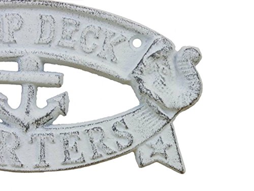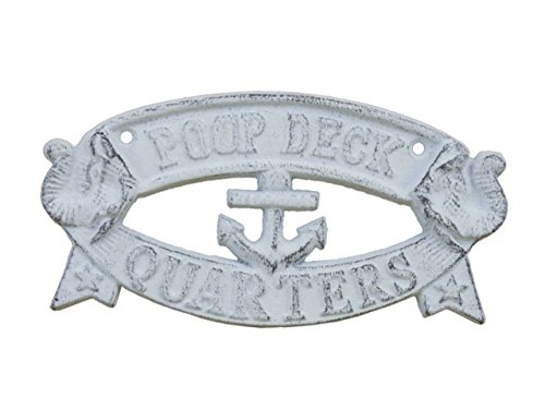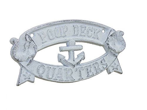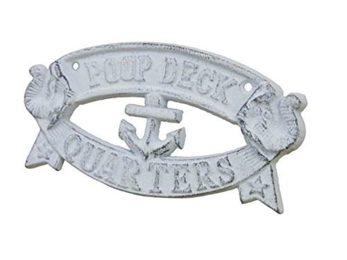 Ideal for posting in a boat, Boathouse or any room featuring a nautical decor theme, this whitewashed cast iron poop deck quarters sign 9 inch clearly informs everyone what room it identifies. With a textured background and framing suggestive, this distinctive sign will be perfectly at home on you boat, or make you feel like you re on your boat when at home or the office. --Note: wall mounting hardware not included.