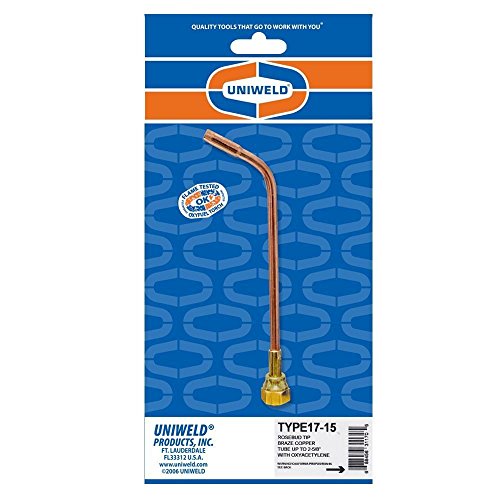 Uniweld Type17-15 rosebud heating tip is capable of brazing 1/8" to 2 5/8" of copper. Tip elbow is copper, mixer and nut are brass. Overall length is 7". Has two O-Ring seals so tip nut only needs to be firmly hand tightened. Tip will fit either the 71 or WH550 welding handle.