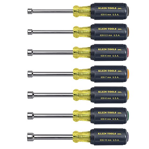The Klein Tools 7-Piece Metric Nut Driver Set features exceptionally strong drivers made from heat-treated, tempered steel and sport cushion-grip handles to resist slippage and increase potential torque. Each shaft is fully chrome plated to resist corrosion, providing you with lasting durability and performance. Standard length for most applications. Fits over long bolts and studs. Internal flanges provide solid, twist-resistant shaft anchor. Tip-Ident quickly identifies nut driver and size. Full hollow shafts facilitate work on stacked circuit boards or other long bolt applications. Premium chrome plated shaft for smooth feel and corrosion resistance. Cushion-Grip handle allows for greater torque and comfort. Handle end is also color coded for easy identification. Meets or exceeds applicable ASME/ANSI specifications. For more than 160 years, Klein Tools has manufactured premium-quality, professional-grade hand tools that deliver the performance, durability and precision needed to get the job done right. Our family of engineers, workers and craftsman continue to put six generations of expertise into every tool we create by using only the highest quality materials, superior workmanship, and keeping manufacturing as close to home as we can. Klein isn't just the name of our company, it's also our family name. And since we're an American company that's family-owned and family-run, you know you can count on us to be here tomorrow. Klein Tools doesn't just make great products, we make great products that stand up to the demands of the professionals who use them every day ... Since 1857.