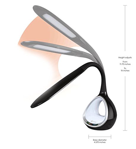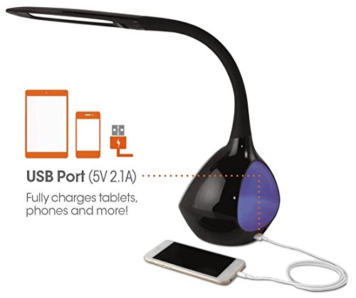 Color:Black Color your world with the LED desk lamp with color changing tunnel. The base has a unique color tunnel that Glows either in the color of your choice or cycles through the entire color spectrum. The super bright white OttLite leds adjust to 3 color temperatures, the 4 brightness settings have a maximum of 500 lumens and the diffuser provides smooth, uniform lighting. A flexible rubberized neck and long 9.5 inch (24.13 cm) shade provides OttLite natural daylight LED illumination wherever you need it. And the 5V, 2.1a built-in USB port fully charges smartphones and tablets. Great for dorm rooms, bedrooms, offices or anywhere you'd like a lamp with personality. With OttLite you can see details clearly so you can do what you LOVE, longer.