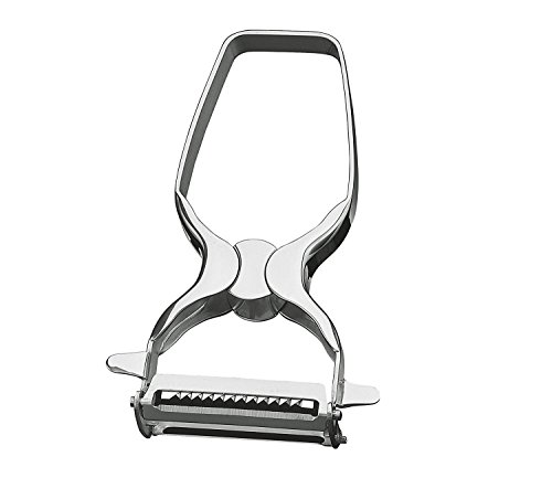 Founded in Solingen Germany by Artur Schmitz in 1923, the story of Kuchenprofi is one of diligence, innovation and refinement. Early on, Kuchenprofi realized the need for affordable functional tools that make the kitchen more efficient and more enjoyable. The name of Kuchenprofi reflects strength, quality and functionality demanded by chefs around the world. Kuchenprofi made for professionals, now available to anyone passionate about cooking. Peels fruit and veggies. Create delicate julienne strips - all from the same handy tool. Kuchenprofi's double-bladed Vegetable Peeler has a razor-sharp blade to peel potatoes, cukes, apples and more. plus a special serrated blade to shave thread-thin strips and decorative curls, all of the same, uniform size. Now one single tool can peel a potato, then turn it into a mountain of matchstick fries. Crafted of the finest 18/10 stainless steel that's dishwasher safe for easy clean-up and effortless service. 3-inch L by 4-3/4-inch W by -3/4-inch D.