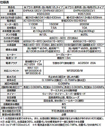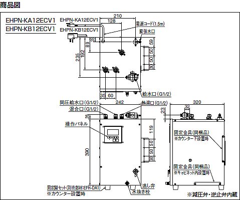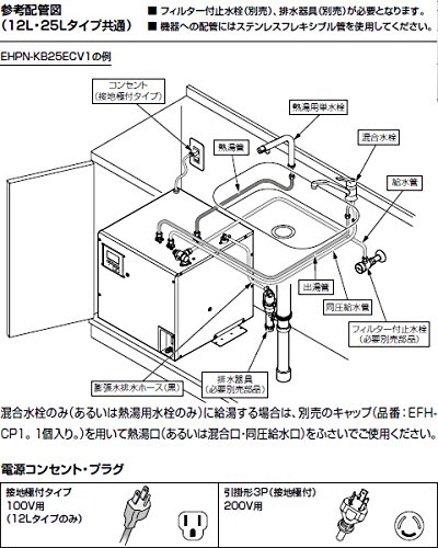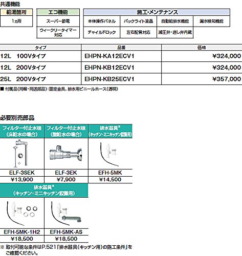 適温給湯で安心して使える飲料用小型電気温水器。 コンパクトでミニキッチンにも収まります。 タンク容量:12L ■付属品(同梱・同送部品):固定金具、排水用ビニールホース(透明) <共通機能> ●給湯箇所:1ヵ所 ●エコ機能:スーパー節電、ウィークリータイマー対応(オプション) ●施工・メンテナンス:本体操作パネル、バックライト液晶、自動給排水機能、漏水検知機能、チャイルドロック、左右配管対応、減圧弁・逃し弁内蔵 ●本体操作パネル(バックライト液晶) ●自動給排水機能 ●スーパー節電 ●先止め式 ●漏水検知機能 ●チャイルドロック ●適温出湯