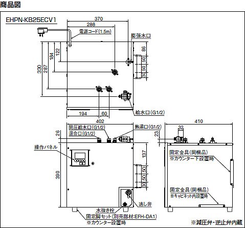 適温給湯で安心して使える飲料用小型電気温水器。 コンパクトでミニキッチンにも収まります。 タンク容量:25L ■付属品(同梱・同送部品):固定金具、排水用ビニールホース(透明) <共通機能> ●給湯箇所:1ヵ所 ●エコ機能:スーパー節電、ウィークリータイマー対応(オプション) ●施工・メンテナンス:本体操作パネル、バックライト液晶、自動給排水機能、漏水検知機能、チャイルドロック、左右配管対応、減圧弁・逃し弁内蔵 ●本体操作パネル(バックライト液晶) ●自動給排水機能 ●スーパー節電 ●先止め式 ●漏水検知機能 ●チャイルドロック ●適温出湯