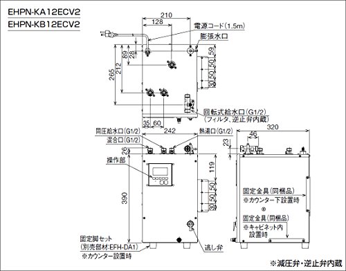 ・標準出湯量:洗い物時:約34L(給水温度15℃、タンク貯湯温度はわきあげ最高温度、出湯温度38℃の条件で一度に使用できる湯量)、給茶時:約100杯(わきあげ温度90℃)(コップ1杯100ccとして)