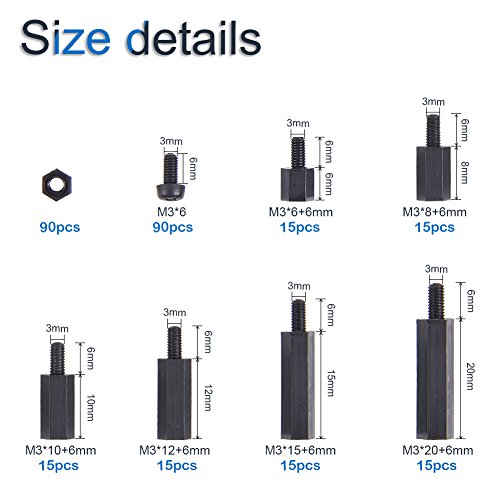 - 六サイズM3 x 6mm + 6mm、M3 x 8mm + 6mm、M3 x 10mm + 6mm、M3 x 12mm + 6mm 20pcs、M3 x 15mm + 6mm、M3 x 20mm + 6mm。