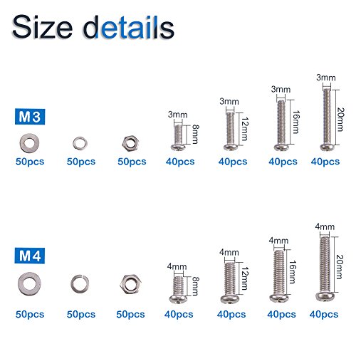 - 8サイズの詰め合わせ:M3×8mm、M3×12mm、M3×16mm、M3×20mm、M4×8mm、M4×12mm、M4×16mm、M4×20mm。