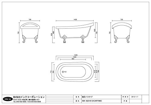 〔INK-0201013H(ART008)〕 W1450 猫足バスタブ 猫脚/プッシュ式排水栓:シルバー(銀)・ゴールド(金)・ブラック(黒)3種類 【本体サイズ:W1450*D740*H770】 【セット内容】 猫足バスタブ本体(排水栓付属) 塩ビ製排水ジャバラパイプ 〇本体サイズ:幅145×奥行74×高77cm 【重量:約40.0kg】 【水量:約135L】 【備考】 1.オーバーフローは無しのタイプとなります。 2.猫脚・プッシュ式排水栓はシルバー(銀)、ゴールド(金)、ブラック(黒)の3色からお選び頂けます。 3.浴槽カラー(内側、外側)は緑、赤、黒に変更可能です。追加料金は税別30,000円となります。 4.足は取り外し可能ですが、再度取り付けるときは高さ調整が必要です。 5.排水栓は蓋を押下げして開閉させるプッシュアップ式となります。 6.シャワー・蛇口は別売りとなっております。 7.排水パイプ(塩ビ製ジャバラパイプ)は付属しております。 8.排水トラップは付属しておりませんので、ご注意下さい。 9.在庫が無い場合、ご注文から納品まで約1ヶ月から1ヶ月半お待ち頂く場合がございます。 ■ご不明な点などございましたらお気軽に当社までお問い合わせ下さいませ。