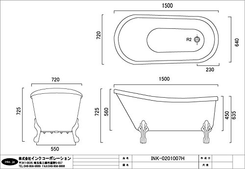〔INK-0201007H〕 W1500 猫足バスタブ 猫脚/プッシュ式排水栓カラー:シルバー(銀)・ゴールド(金)・ブラック(黒)3色 【本体サイズ:W1500*D720*H725】 【セット内容】 猫足バスタブ本体(排水栓付属) 塩ビ製排水ジャバラパイプ 〇本体サイズ:幅150×奥行72×高72.5cm 【重量:約50.0kg】 【水量:約240L】 【備考】 1.オーバーフローは無しのタイプとなります。 2.猫脚・プッシュ式排水栓はシルバー(銀)、ゴールド(金)、ブラック(黒)の3種類からお選び頂けます。 3.浴槽カラー(内側、外側)は緑、赤、黒に変更可能です。追加料金は税別30,000円となります。 4.足は取り外し可能ですが、再度取り付けるときは高さ調整が必要です。 5.排水栓は蓋を押下げして開閉させるプッシュアップ式となります。 6.シャワー・蛇口は別売りとなっております。 7.排水パイプ(塩ビ製ジャバラパイプ)は付属しております。 8.排水トラップは付属しておりませんので、ご注意下さい。 9.在庫が無い場合、ご注文から納品まで約1ヶ月から1ヶ月半お待ち頂く場合がございます。 ■ご不明な点などございましたらお気軽に当社までお問い合わせ下さいませ。