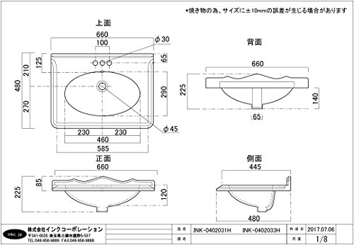 - 洗面ボウル 陶器 オーバーカウンタータイプ 三つ穴水栓用 埋め込み スクエア 幅66cm INK-0402033H