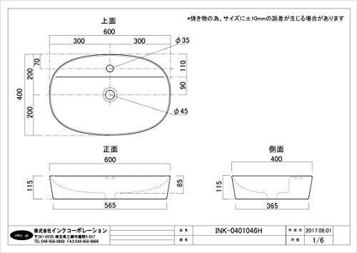 洗面ボウル 陶器 オンカウンタータイプ オーバル 【幅60×奥行40×高11.5cm】 INK-0401046H