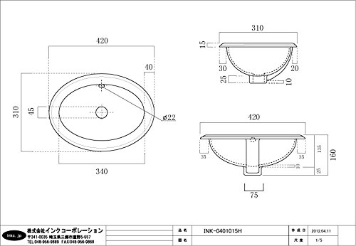 洗面ボウル 陶器 オーバーカウンタータイプ 埋め込み オーバル 幅42cm INK-0401015H