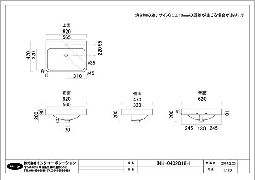 ●陶器製品寸法には公差がございます。 ●蛇口・台は別途でのご購入となります。 ●レバー式排水栓は使用出来ませんので、ご注意ください。 ●取付工事は弊社でも承っておりますので、 お気軽にご相談くださいませ。 または お近くの工務店様にご相談くださいませ。 ●プッシュアップ式排水栓1個が付属します。 【 サイズ:W620*D470*H200】